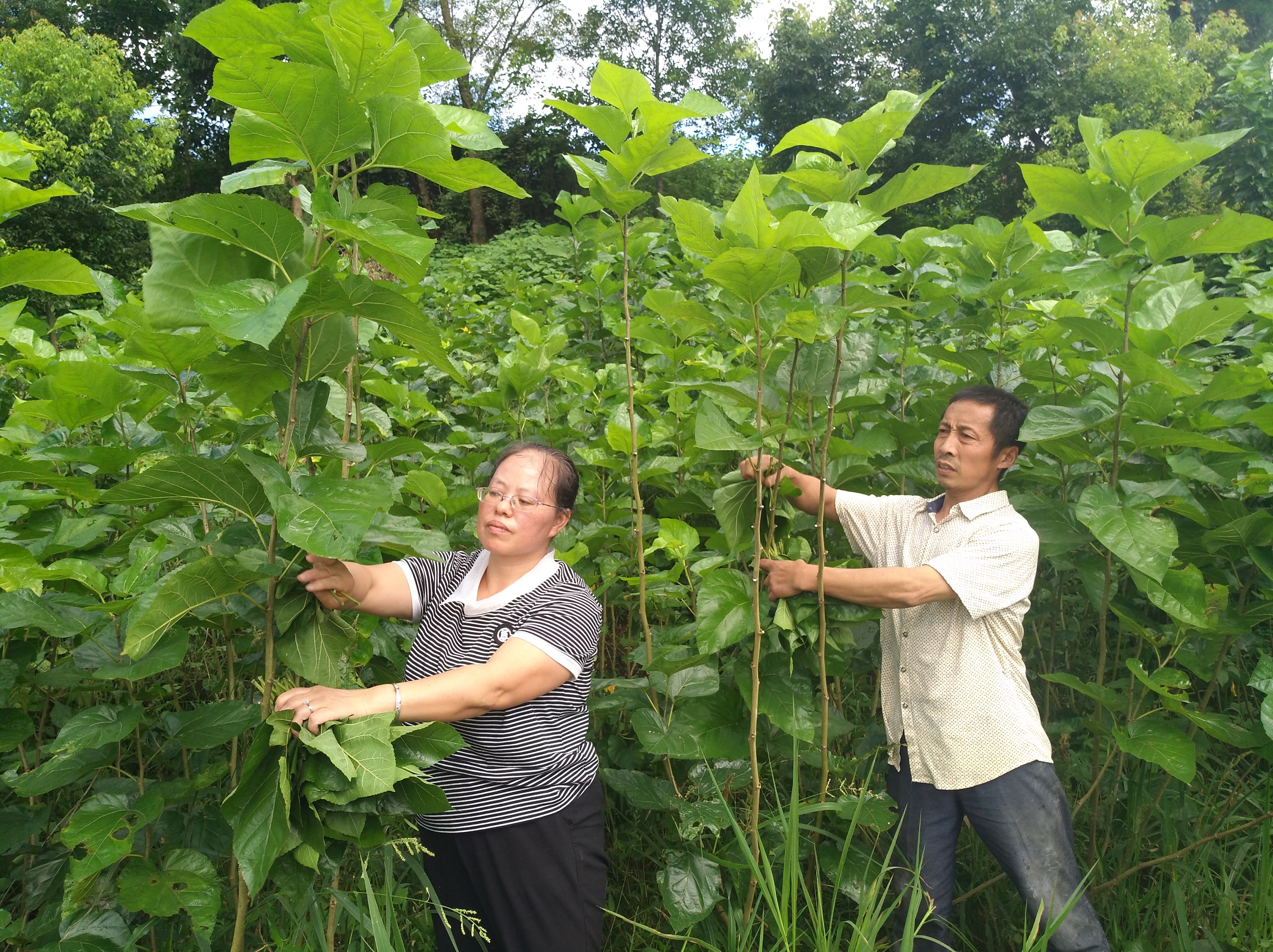 黄进与丈夫杨家荣一起采摘桑叶