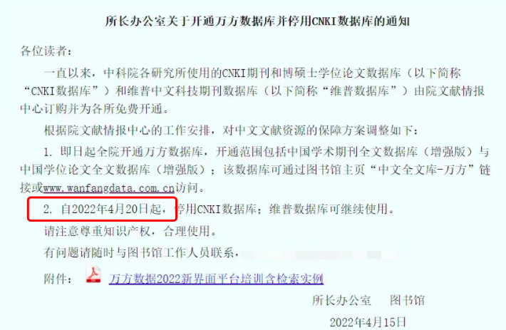 上述中科院图书馆相关工作人员对红星资本局表示,研究所此前通知会从4月20日起停用知网数据库,“今日登陆时,已经发现无法在知网下载论文”,并建议同学们可以改用万方数据库。